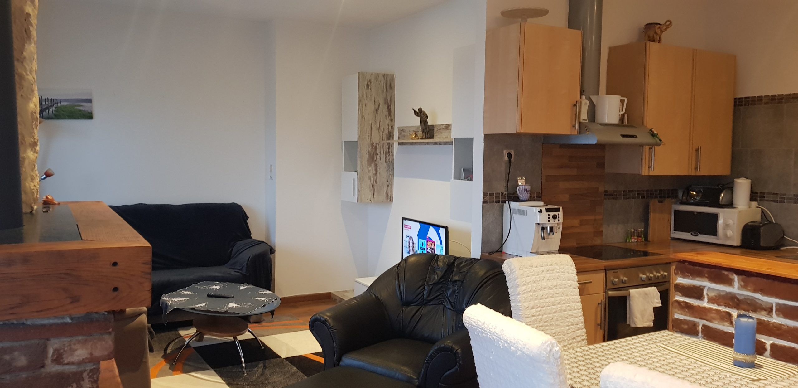 TRAUMBLICK, 2 Schlafzimmer schön eingerichtet mit jeweils 2 Betten - Wohnzimmer mit offener Küche und Couch beim TV Apparat und offenem Kamin.